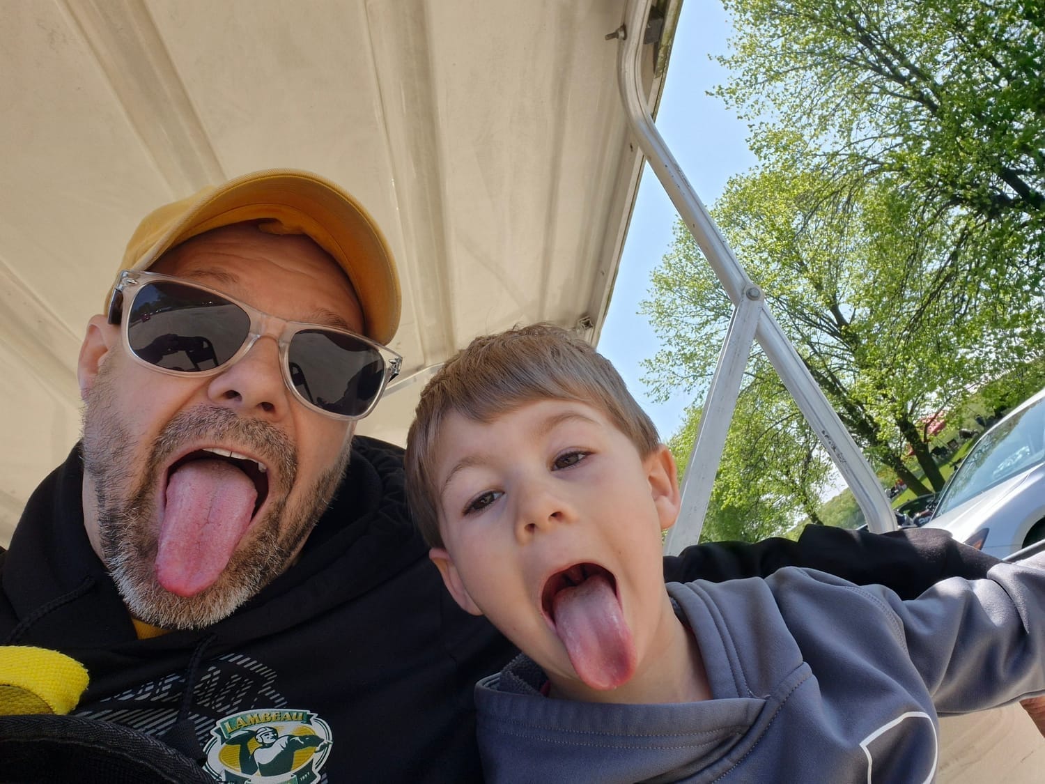 Our superhero and his trusty sidekick (a.k.a. Dad) came to meet legendary racer Josh Hayes. They waited for him for a whole HOUR. That’s like…forever in kid time. But Josh was as sneaky as a racetrack ninja, and the only time they saw him was when he zoomed by on a tiny moped going somewhere mysterious. It was like trying to catch a speeding pickle.